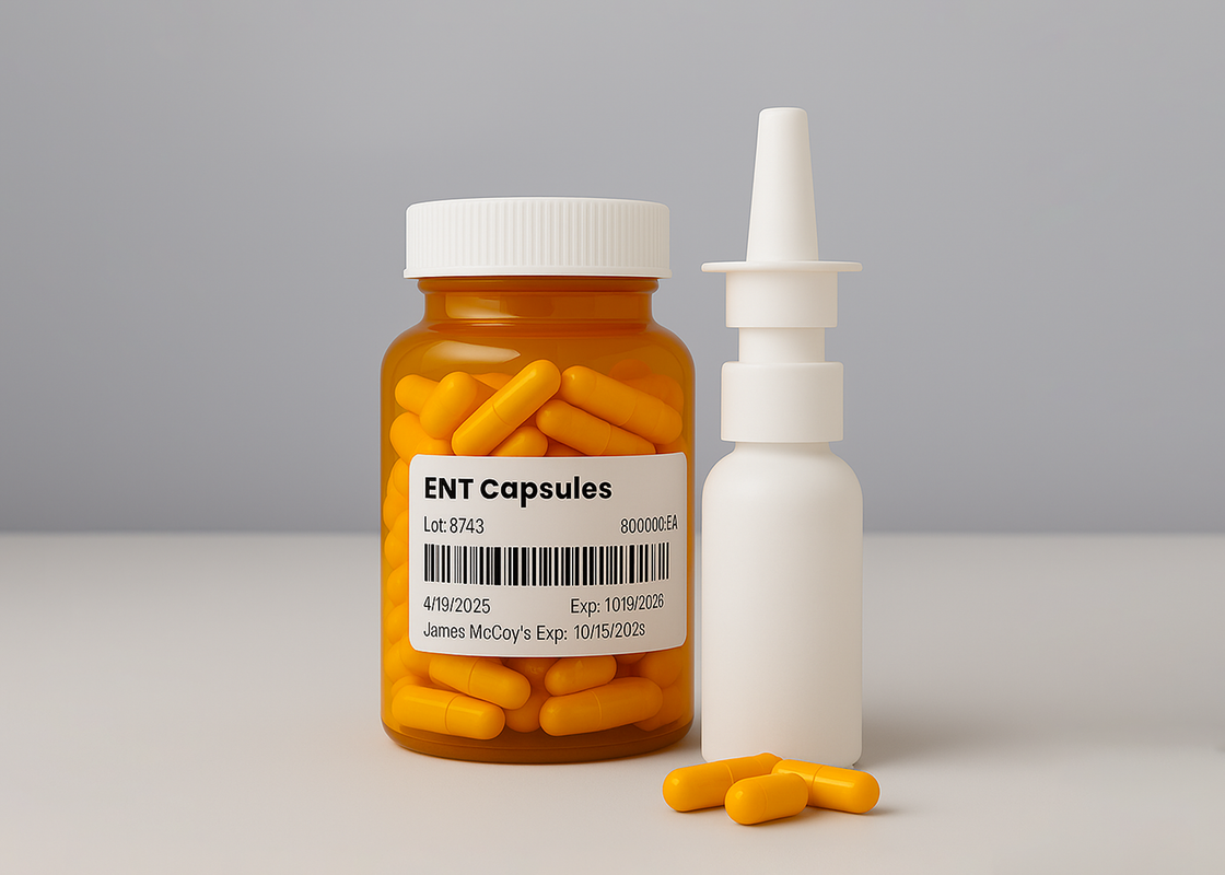 An ENT (ear, nose, and throat) capsule is a specially prepared capsule that contains a precise blend of antibiotics, steroids, and dispersal agents. Rather than being swallowed, the powder from the capsule is mixed with a nasal irrigation solution and used to rinse the nasal passages—delivering medication directly to inflamed or infected sinus tissues.